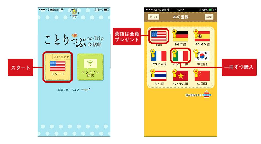 ことりっぷ会話帖Pro(本体価格 150円)をご購入された方には、英語版をプレゼント!他の言語もご利用になりたい場合は1冊360円で追加購入できます。